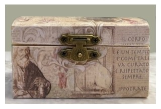 Un bauletto di legno, ricoperto da stampe a tema medico e di citazioni di Ippocrate. La bomboniera ideale per i laureati in discipline mediche e anche farmacologiche, un delizioso ricordo per i tuoi ospiti nel tuo giorno speciale!